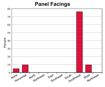 PanelsPercent None 1 5 Horizontal 2 10 North 338-022 0 0 Northeast 023-067 0 0 East 068-112 0 0 Southeast 113-157 0 0 South 158-202 0 0 Southwest 203-247 16 76 West 248-292 2 10 Northwest 293-337 0 0 Total 21 101